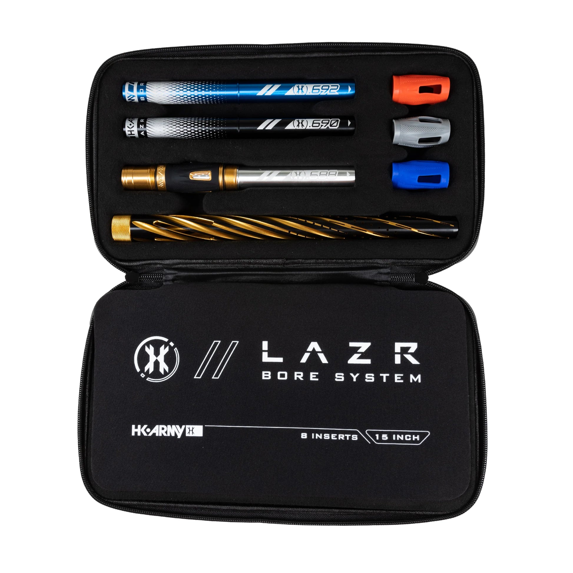 The LAZR Elite "Orbit" Barrel Kit comes complete with 8 Barrel Bore Inserts, an Elite Barrel Tip, Bore Sizer and 4 interchangeable Accent Grips. The LAZR Elite Barrel Kit is packaged with an HK Army EXO Barrel Protective Case.